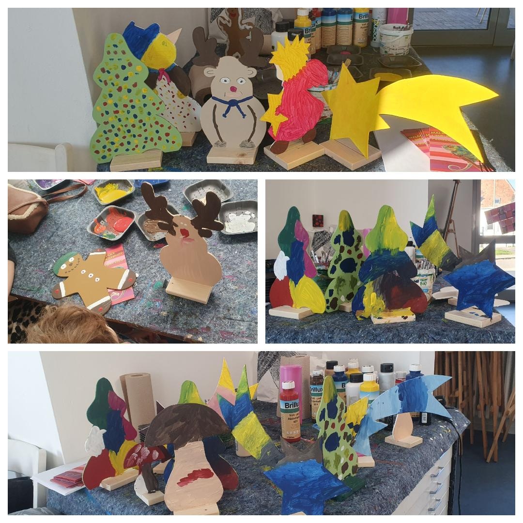 Das Team der Malschule, Sabine Amelung und Michaela Jäkel unterstützen die Malaktion von Peter Nowack schon viele Jahre. Den Rohlingen, die Peter Nowack zuvor aus Sperrholz aufgemalt, ausgesägt, geschliffen und grundiert hat, verpassten fast 50 kleine und große Künstler, mit Pinsel und Farbe ein buntes Farbenkleid. Die mit großem Eifer bemalten Tannenbäume, Schneemänner, Engel, Lebkuchenmännchen und Sternschnuppen wurden mit Stolz mit nach Hause genommen. Es war sehr schön zu sehen mit wieviel Engagement die Künstler die Holzfiguren bemalten. Der Erlös von 600 Euro geht, wie die Jahre zuvor, an die DLFH Aktion für krebskranke Kinder Verband Pfalz e.V. sodass sich alle über die Resonanz dieser tollen Aktion erfreuen können.