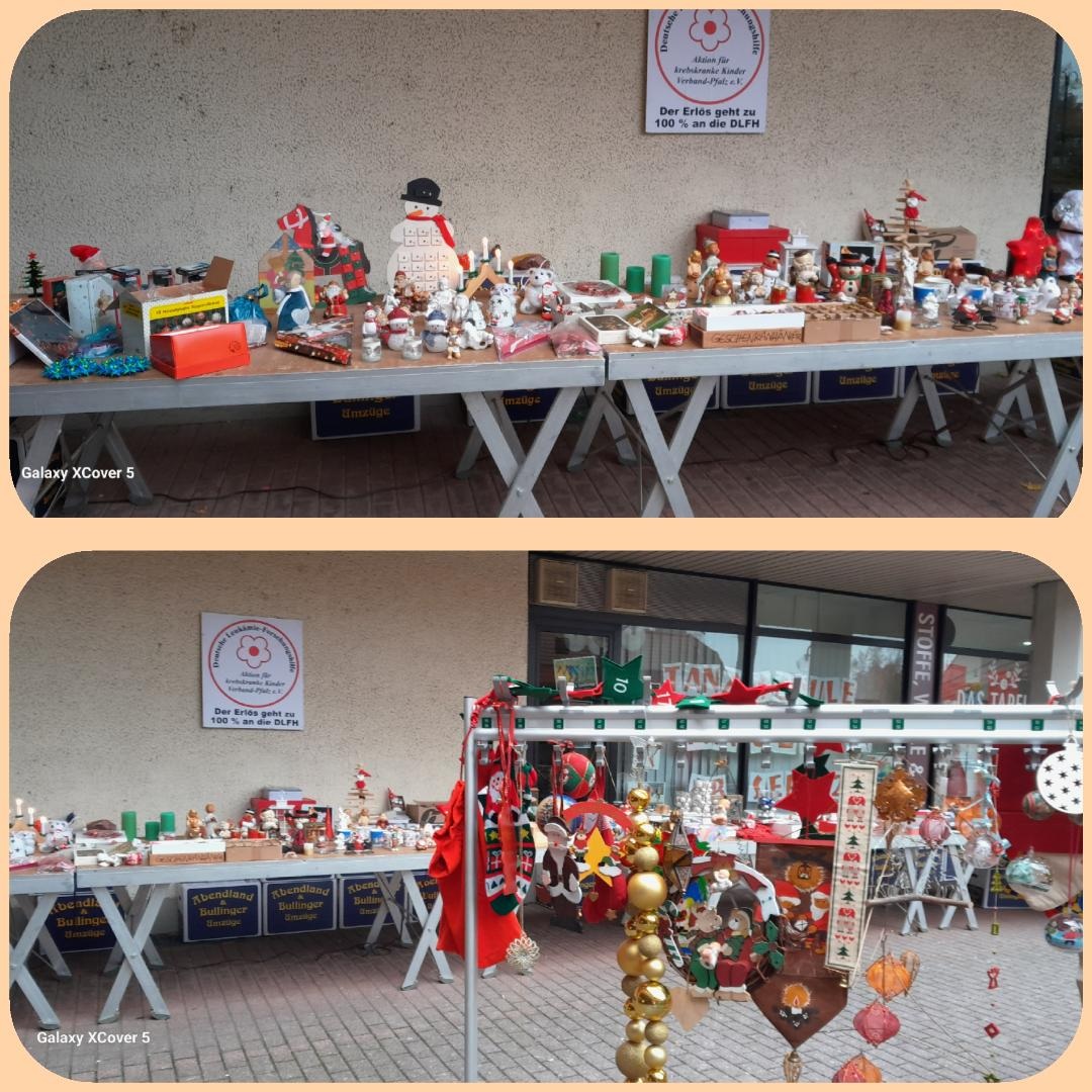 Der schon fast zur Tradition gewordene Verkauf von gut gebrauchten Weihnachtsartikel an mehreren Samstagen vor Weihnachten ist auch eine gute Einnahmequelle für den Initiator. Mit Hilfe seiner Freunden Brigitte und Rainer Mathes, Jonas und Frank Emmert baute Peter-Franz Nowack schon morgens gegen 6.30 Uhr seine Tische zwischen dem Schlüsseldienst Stadtherr und dem tapferen Schneiderlein am Burgunder Platz in Limburgerhof auf und dekorierte seinen zu verkaufenden Weihnachtsschmuck. Viele Käufer kamen und nahmen gerne etwas zum Verschönern ihres Zuhauses von der Weihnachtsdeko mit. An einem Samstag war auch die Malaktion. Beide Aktionen ergaben zusammen die Summe von 2.318,00 Euro. Der Erlös kommt der DLFH Aktion für krebskranke Kinder Verband Pfalz e. V. zu Gute, die die krebskranken Kinder und deren Familien auf vielfältiger Weise unterstützt. Da sind die Kinderkrankenschwester, die die Kinder zu Hause betreut, die Forschung und die Rehabilitationsklinik Katharinenhöhe in Schönwald im Schwarzwald, sehr dankbar, dass es solche Organisationen wie die DLFH gibt.